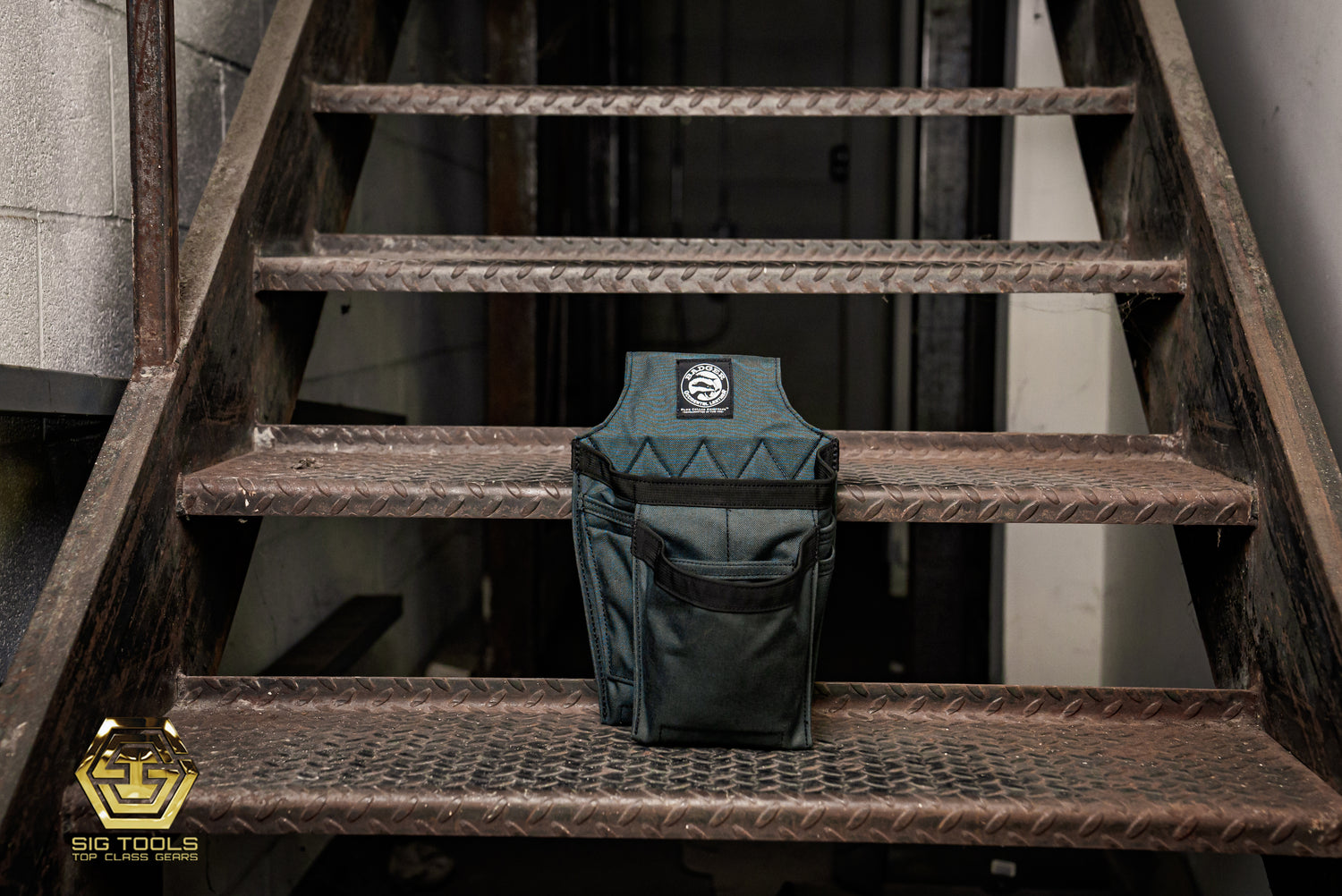 Trimmer Tool Bag: Three narrow tool slots and 2 wide slots in the main pouch, a wide slot in the lower pouch, a tool loop in the rear, three pencil slots, and a knife slot up front for easy access. Also included the hammer sleeve.
