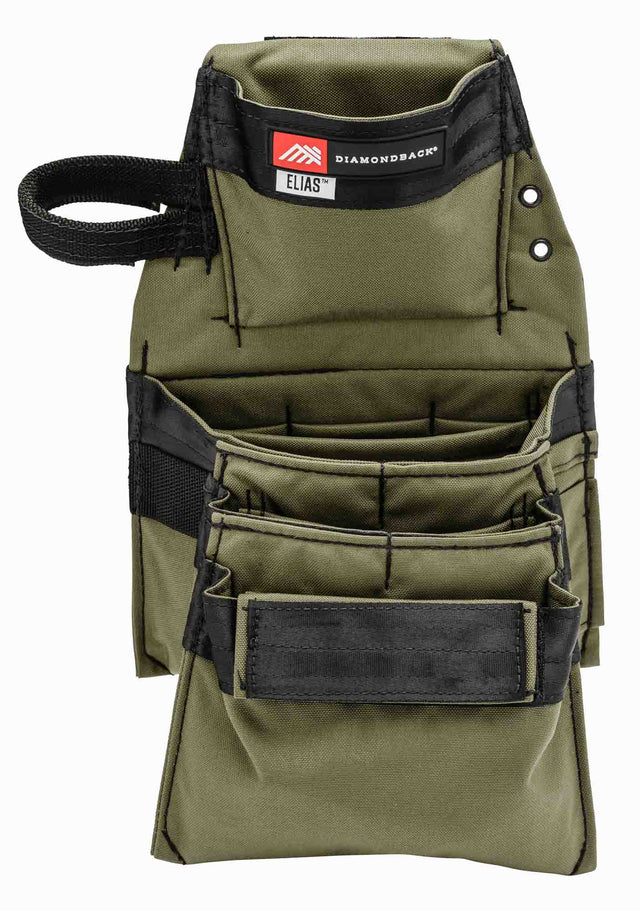 The Elias 2.0 improves upon the extremely popular original Elias. We have incorporated feedback from hundreds of users to create an even better version. The Elias 2.0 feature more accessible, open pockets and resized inner tool slots to accommodate a variety of tools. The outer pocket cover can now be tucked away securely with a strip of loop material located inside the pocket. The tool loop on the original Elias have been replaced with a stiff webbing strip perfect for hanging an impact, hanging one of our DBSax or attaching any Diamondback® clip-on accessory.