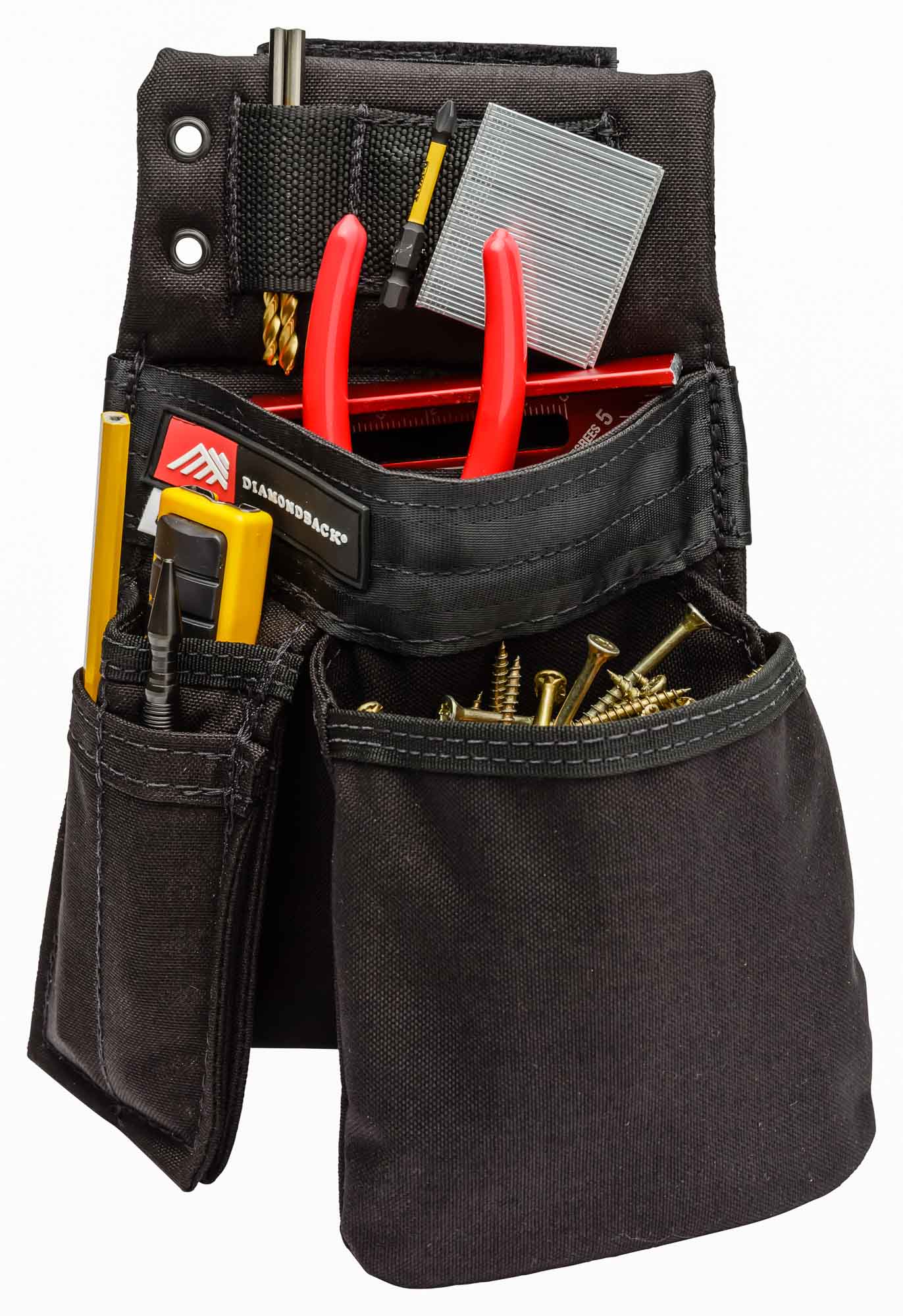 The Clavo is the non-dominant side of our Maestro System.  We designed this as a partner to the Mazo Pouch with the same great team.  While it is our smallest fastener pouch, it includes an internal divider sized for finish strip nails, a rare earth magnet for fasteners or bits, pockets form marking tools and chisels as well as an outside pocket for fasteners or a tape.