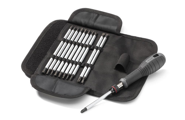 Set of long bits and handle in a practical textile holder. Developed for professional use together with craftsmen. The bit length can be adjusted by inserting them into the handle. Contains slot bits 4, 5.5 and 6.5, PH 1, 2 and 3, PZ 1 and 2, Hex ballpoint 3, 4, 5 and 6 mm, plus Torx® T10, 15, 20, 25, 30 and 40.