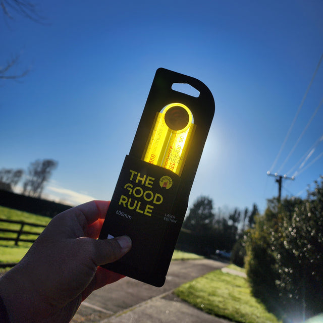 The Laser Edition rule is the original GOOD RULE, optimised for use with laser levels. It enables users to read the laser level line from either side depending on their position relative to the laser level. Created by New Zealand craftsman Regan Low, with today's tradespeople in focus and traditional quality at heart.